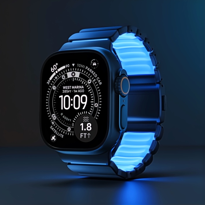 The Icy Blue Glow of Nomad’s Stratos Band gives the Apple Watch Ultra a subtle nighttime personality