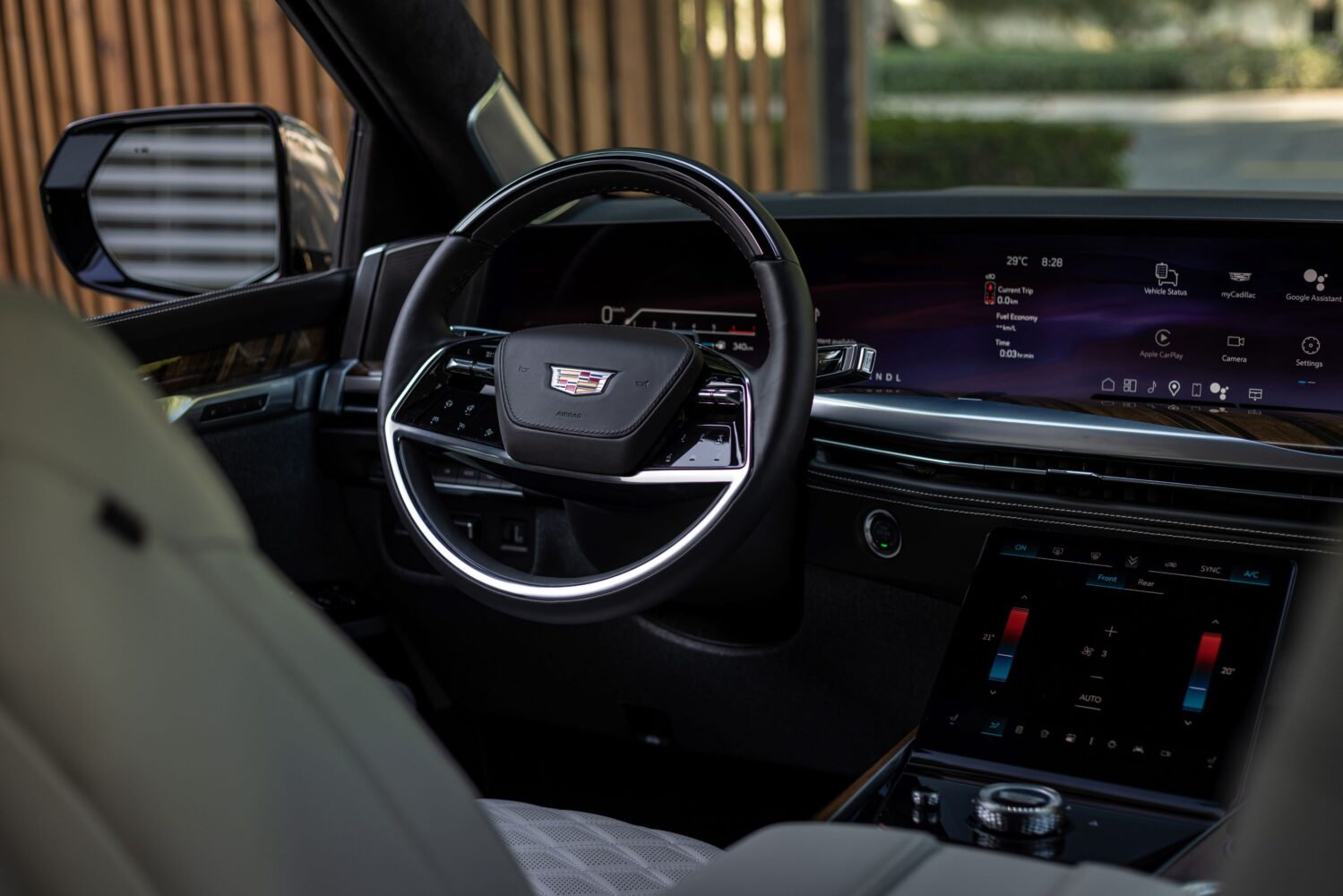 The Escalade-V receives a performance-focused interior with authentic carbon-fiber accents and a unique steering wheel design.