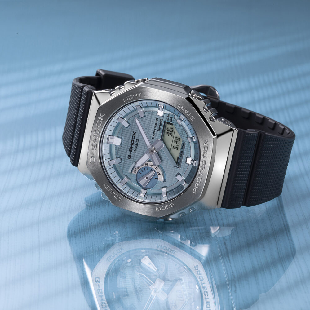 The GBM-2100A incorporates solar power, Bluetooth smartphone connectivity, 20-bar water resistance, a shock-resistant structure, and eco-friendly bio-resin materials. The octagonal bezel — a visual signature of the 2100 series — remains central to the watch’s design, offering a modern interpretation of G-Shock’s rugged identity in a sleeker form.