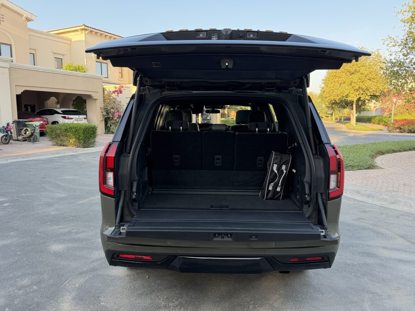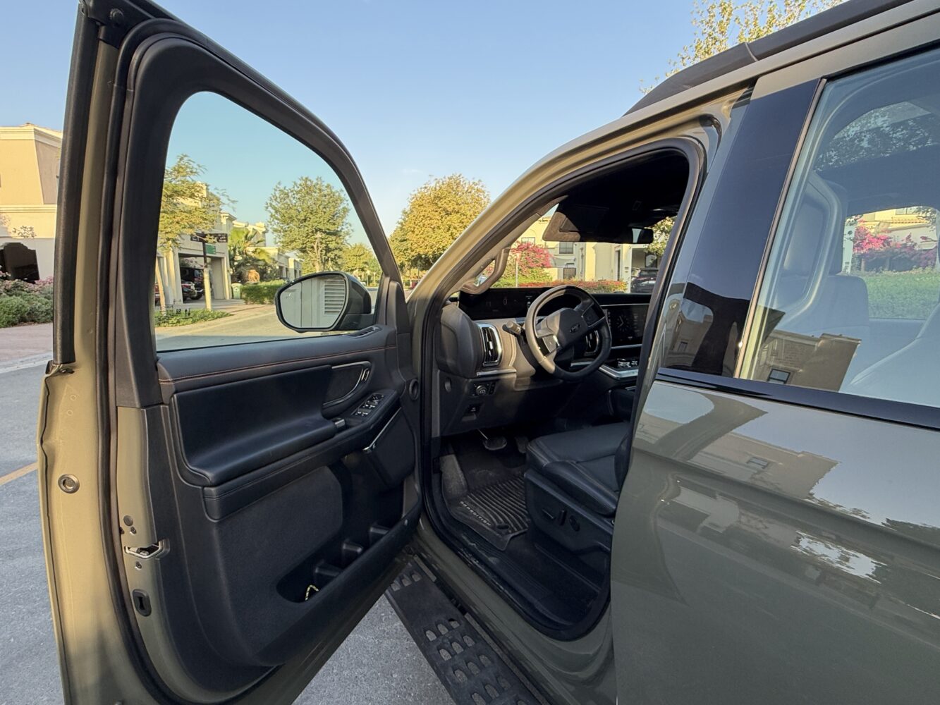 The rear carries a restrained elegance, anchored by LED tail lamps that glow with minimalistic precision. But the true star back here is the split tailgate. The upper section lifts as you’d expect, but the lower section folds open like a pickup tailgate, creating an elevated bench that feels purpose-built for desert sunsets, campsite shawarmas, football tailgates, laptop sprints, and the occasional philosophical moment staring into the dunes. It’s sturdy, stable, and adds a delightful versatility to the Tremor’s personality.