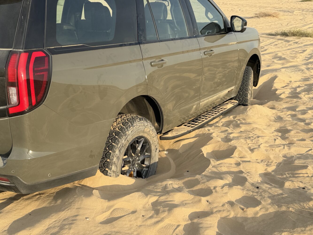 Step one: no panic, no wild throttle. I slotted the dial into 4×4 Low, engaged the rear diff lock, and shifted into the dedicated Sand mode. In this setup, the Expedition does something clever: it relaxes certain traction limits, sharpens throttle behavior, and manages torque more progressively across the wheels, allowing controlled wheelspin where it’s helpful instead of smothering it. The gearbox holds onto lower gears, the turbos stay on song, and the whole SUV feels like it’s bracing itself to climb out of trouble.
