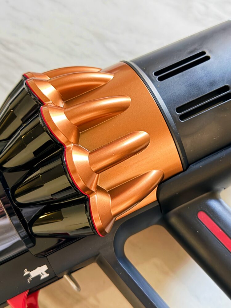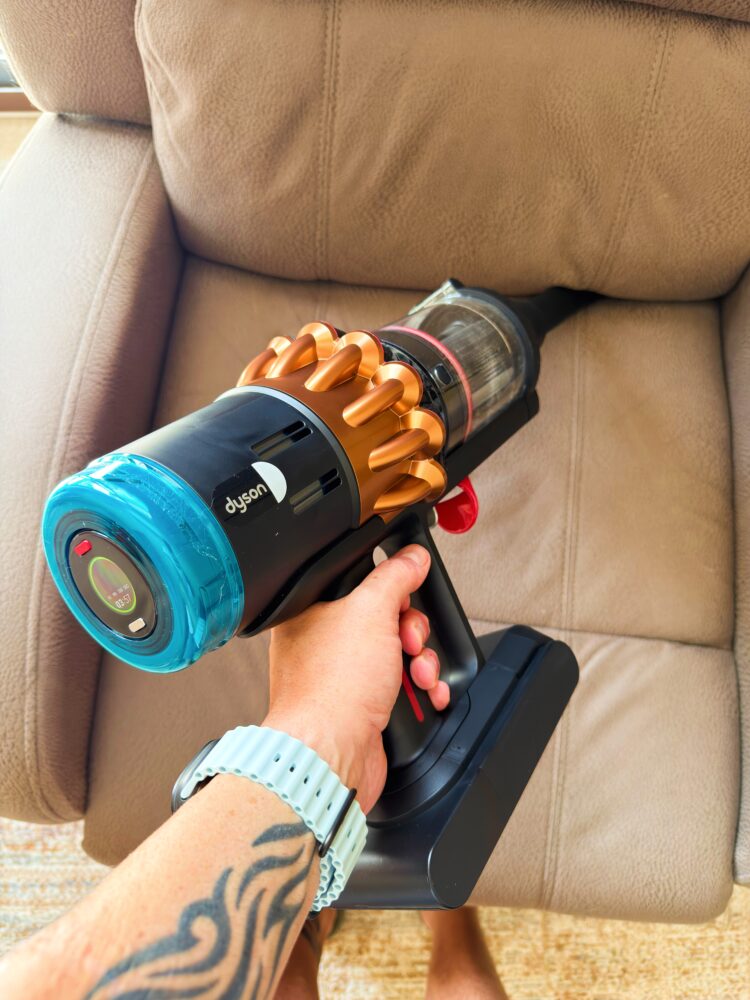 Once assembled, I just stood there for a minute, admiring it. The color scheme — a mix of black, teal, gold, and that signature Dyson purple — manages to look both industrial and elegant. It’s a vacuum that looks like it could belong in Tony Stark’s garage. My wife even said, “Wow, that’s actually… kind of sexy for a vacuum.” She wasn’t wrong.