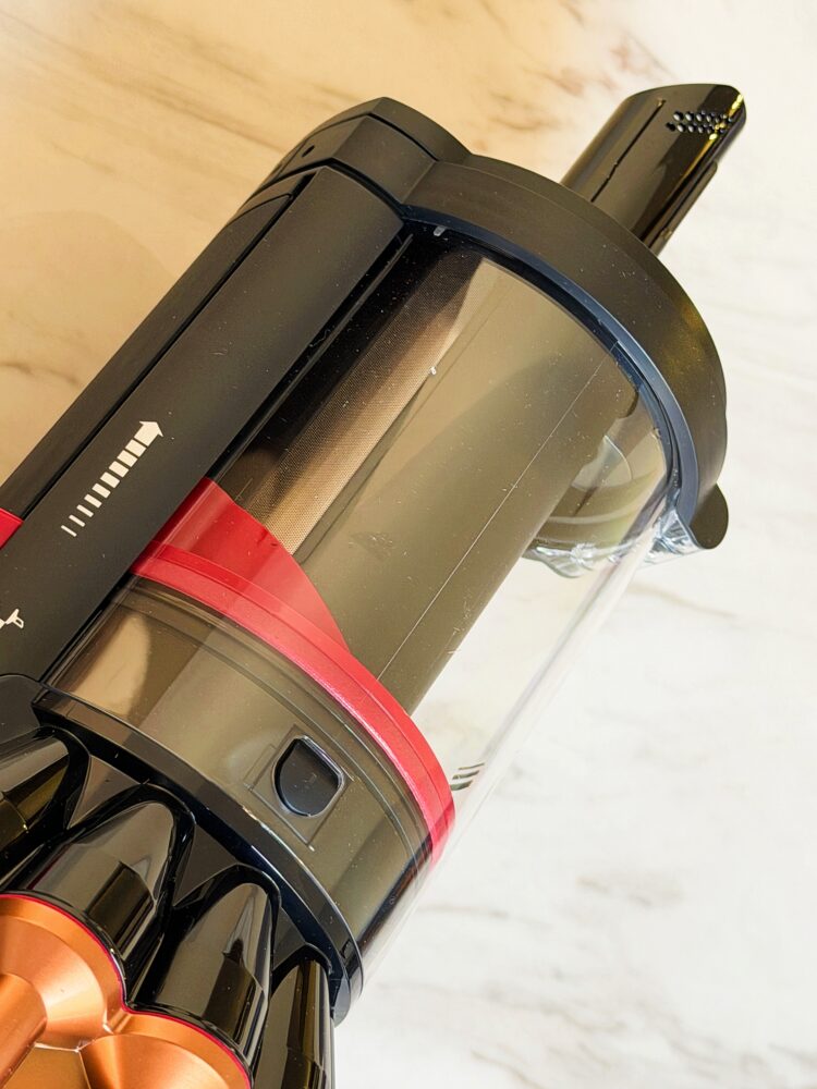 Forget suction power — the CleanCompaktor is what really blew my mind. It’s Dyson’s new system for compressing dirt and debris inside the bin. There’s a little red lever on the canister that you slide down, and as you do, it compacts the gunk into a tight disc of dust and hair. The result? You can vacuum more, empty less, and weirdly, it’s kind of fun.