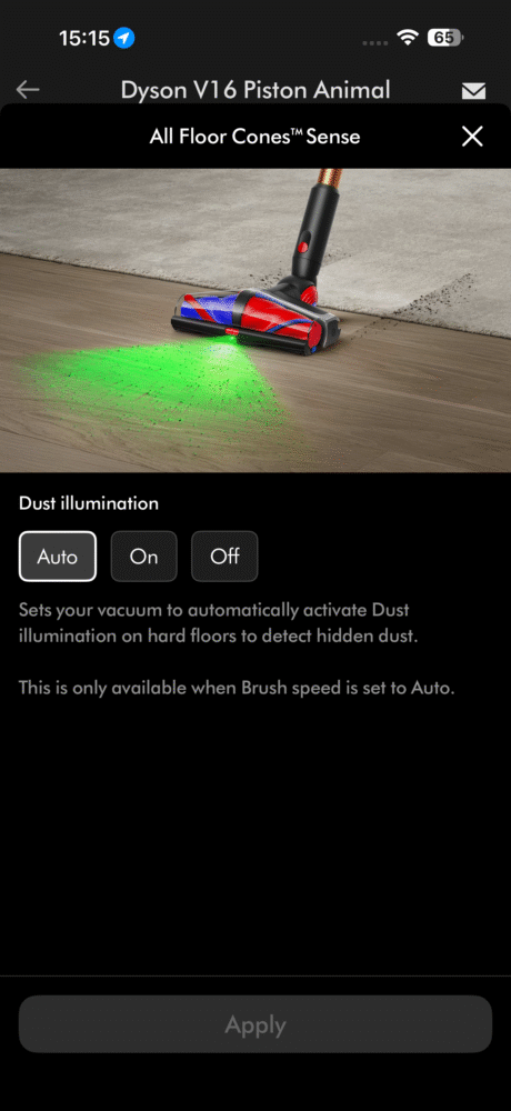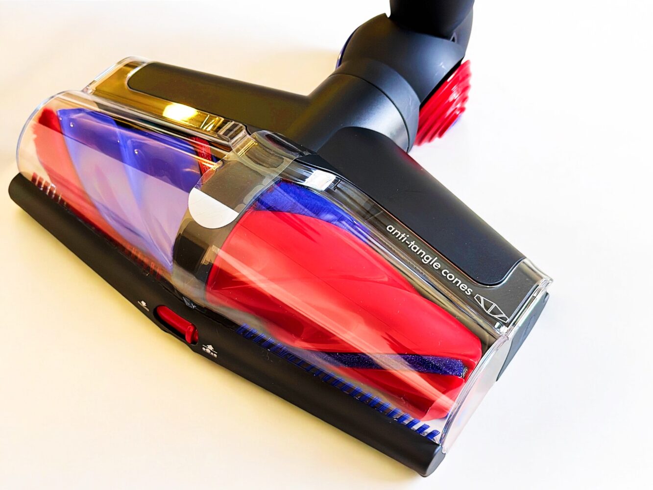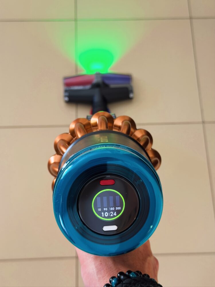 Auto mode is brilliant. The vacuum senses floor type and adjusts suction accordingly. I moved from the hardwood hallway into the living room carpet without touching a button. It was seamless — no switching heads, no toggling between carpet and hard floor modes. The All Floor Cones Sense cleaner head just adapts. And when it hits hard floors, the onboard laser activates, illuminating every microscopic crumb and speck of dust like a forensic crime scene. It’s satisfying, disturbing, and addictive all at once.