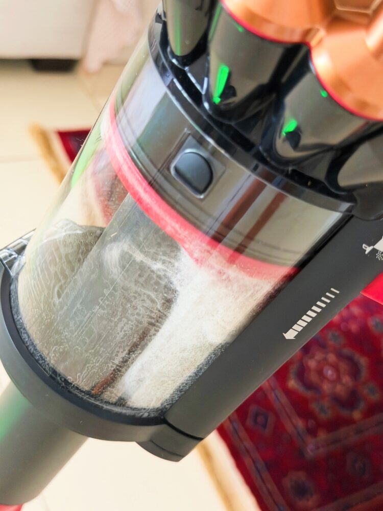 Dyson claims the 1.3L bin can hold 30 days of dust. I don’t buy that for most households — unless you live alone in a spotless apartment — but for me, a man with a dog, carpets, and a strange obsession with popcorn at midnight, I rarely have to empty it. That’s unheard of for a cordless vacuum.