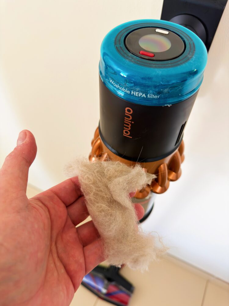 Emptying it is a joy, too. One pull of the lever, and everything ejects cleanly. No hair wrapped around the brush bar, no stuck fluff, no dusty explosion. Dyson calls it hygienic emptying. I call it oddly satisfying.