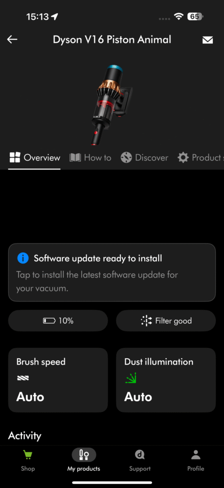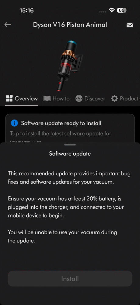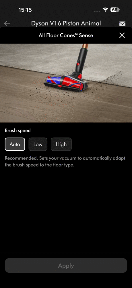 This is the first Dyson (outside their robot lineup) that syncs with the MyDyson app. The setup is easy: scan the QR code on the LCD screen, connect via Bluetooth, and you’re in. The app tracks your cleaning time, battery life, and filter maintenance, and it even lets you order replacement parts directly.