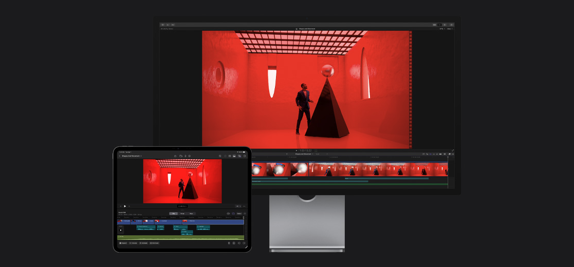 Image alt-text: iPad Final Cut Pro timeline on tablet with project preview playing on an external monitor.