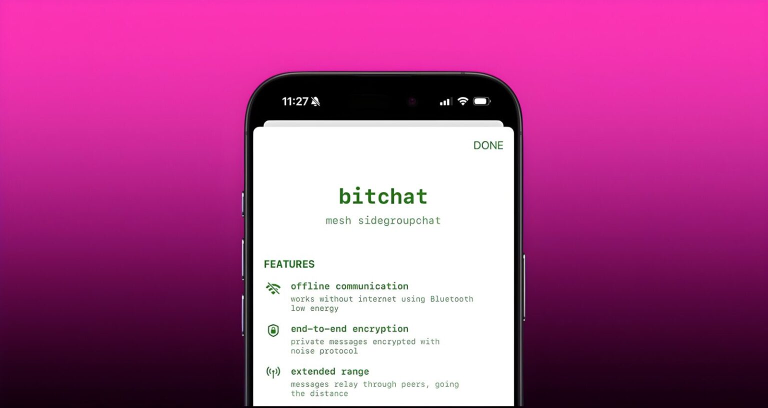 From there, it’s all Bluetooth mesh networking magic. If your friend is nearby, your phone talks directly to theirs. If not, your message bounces through any other phones running Bitchat like a drunk courier hopping taxis. The direct range is about 100 metres, but in a crowd it can stretch to 300. Everything is end-to-end encrypted with Curve25519 and AES‑GCM, which is basically the cryptographic equivalent of wearing an invisibility cloak lined with tinfoil. And if things get spicy, triple-tapping the app’s logo instantly nukes your chats in “panic mode.”