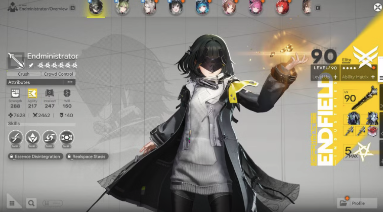 Image: Character progression screen with stats and gear. Alt text: Arknights Endfield character progression and gear interface.