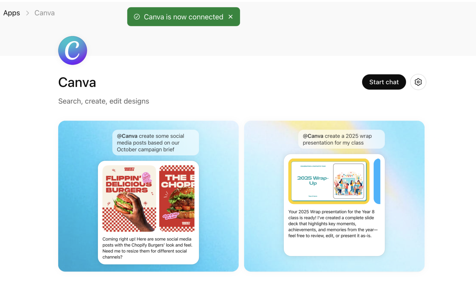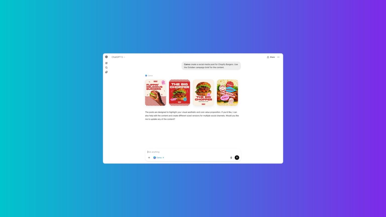 From this point forward, ChatGPT can create Canva designs for you anytime you ask. Presentations, social posts, one-pagers, posters — if Canva can make it, ChatGPT can trigger it.