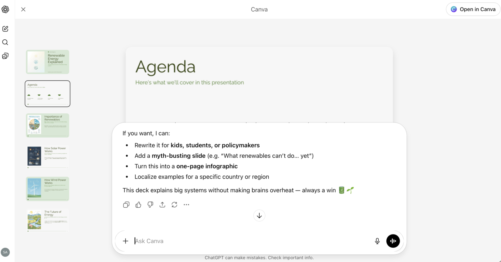 Once ChatGPT finishes, you’ll see slide previews and a link to open the design in Canva. Click it, and the full presentation loads instantly in your Canva workspace.
