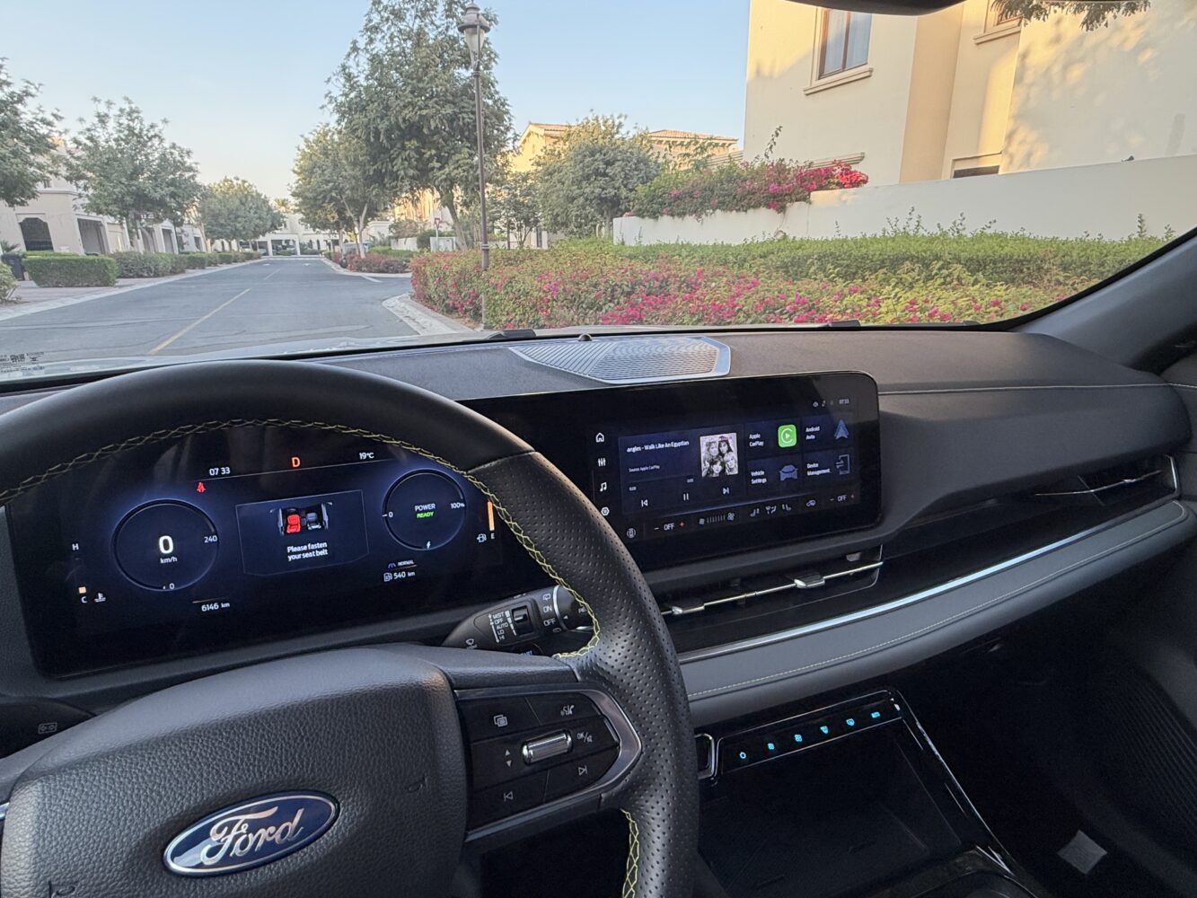 The leather seats, soft yet supportive, are paired with a 10-way power-adjustable driver’s chair that molds to your preferred posture with wintry precision. Long drives feel effortless, helped by Ford’s massive improvements in NVH management. The acoustic glass, a meaningful upgrade, works subtly but effectively, filtering out the noise of Dubai’s busy roads. The result is a cabin atmosphere that feels calmer, more collected, and more premium than its class traditionally offers.