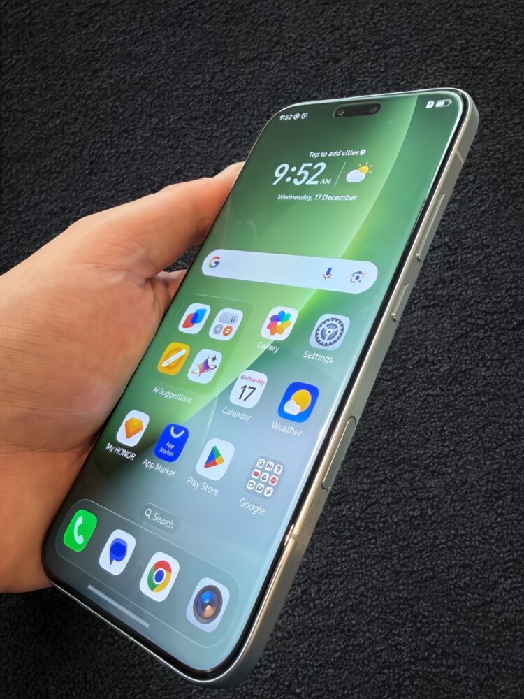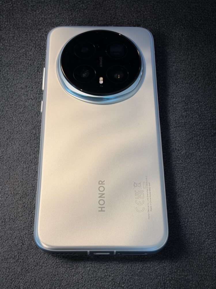 The circular camera module is large, unapologetic, and refreshingly honest. Honor isn’t pretending this phone has a “hidden” camera system. This is a photography-forward device, and the design owns that identity without turning it into a gimmick. On a table, the phone stays relatively stable. In the pocket, the bump is noticeable but never intrusive.