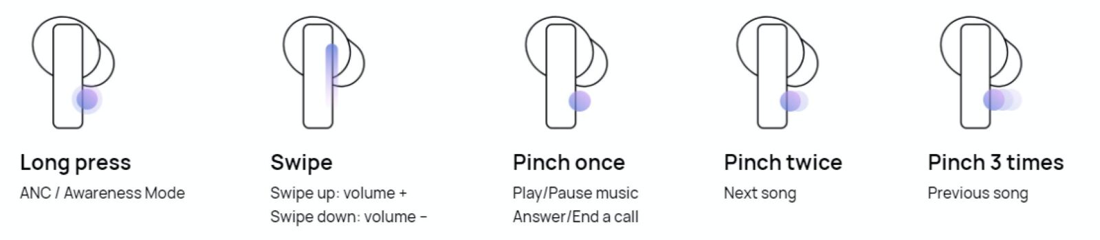 A pinch will play/pause your music and answer calls, with a sliding control to change the volume. Pinch and hold activates the Awareness mode so you can hear your surroundings and have a quick conversation without having to take the earbuds out. You can change what the gestures do for both sides through the AI life app.