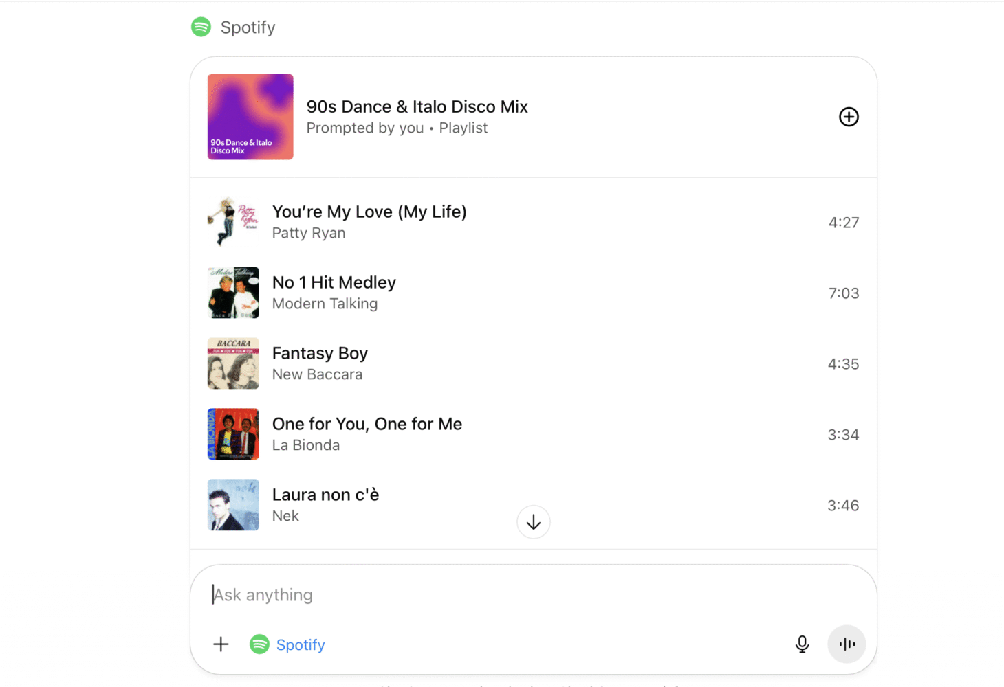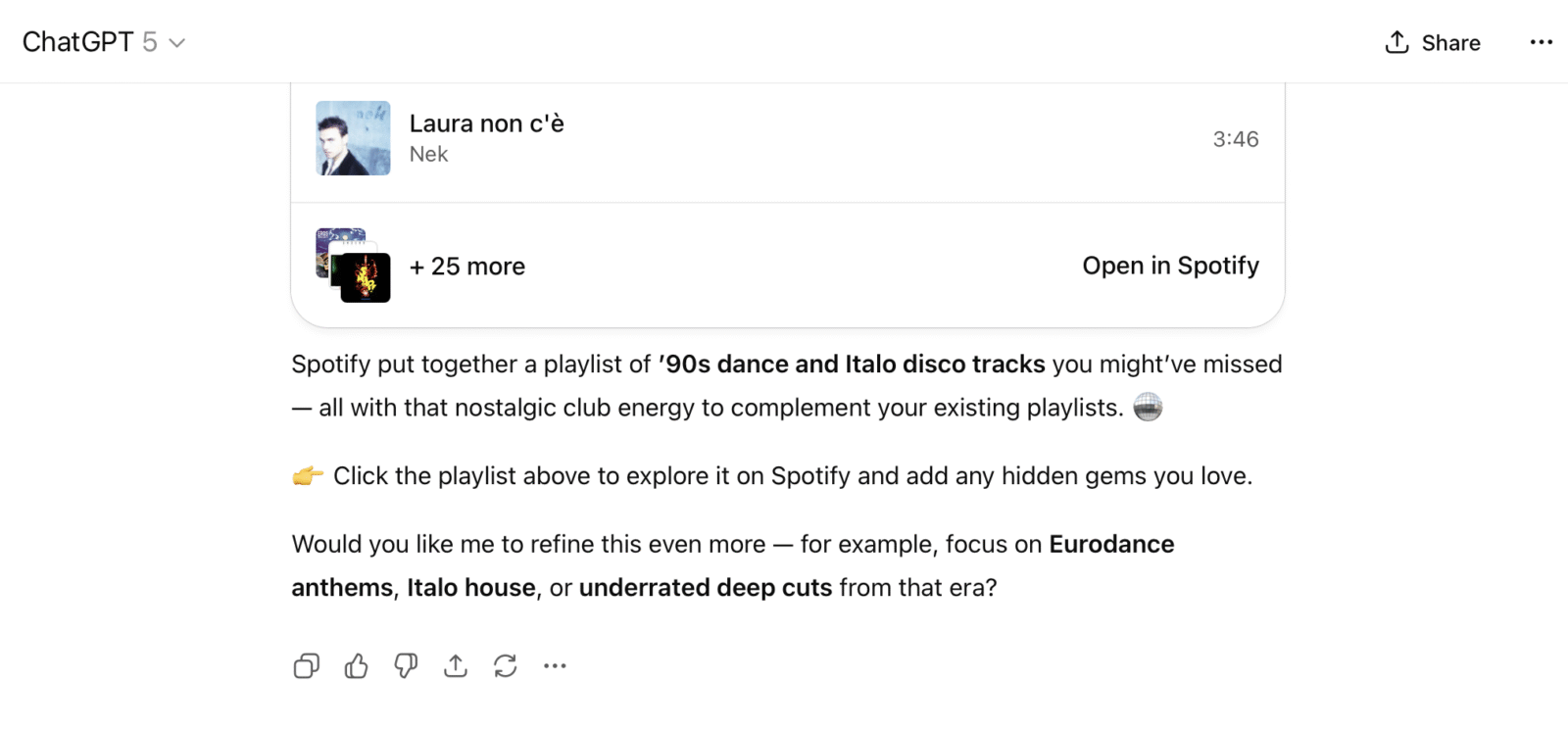 TL;DR: Spotify inside ChatGPT isn’t just smarter than the average playlist — it’s a full-blown music archaeologist that can resurrect forgotten dance floor classics, find Italo disco deep cuts you missed, and make you fall in love with the ’90s all over again.