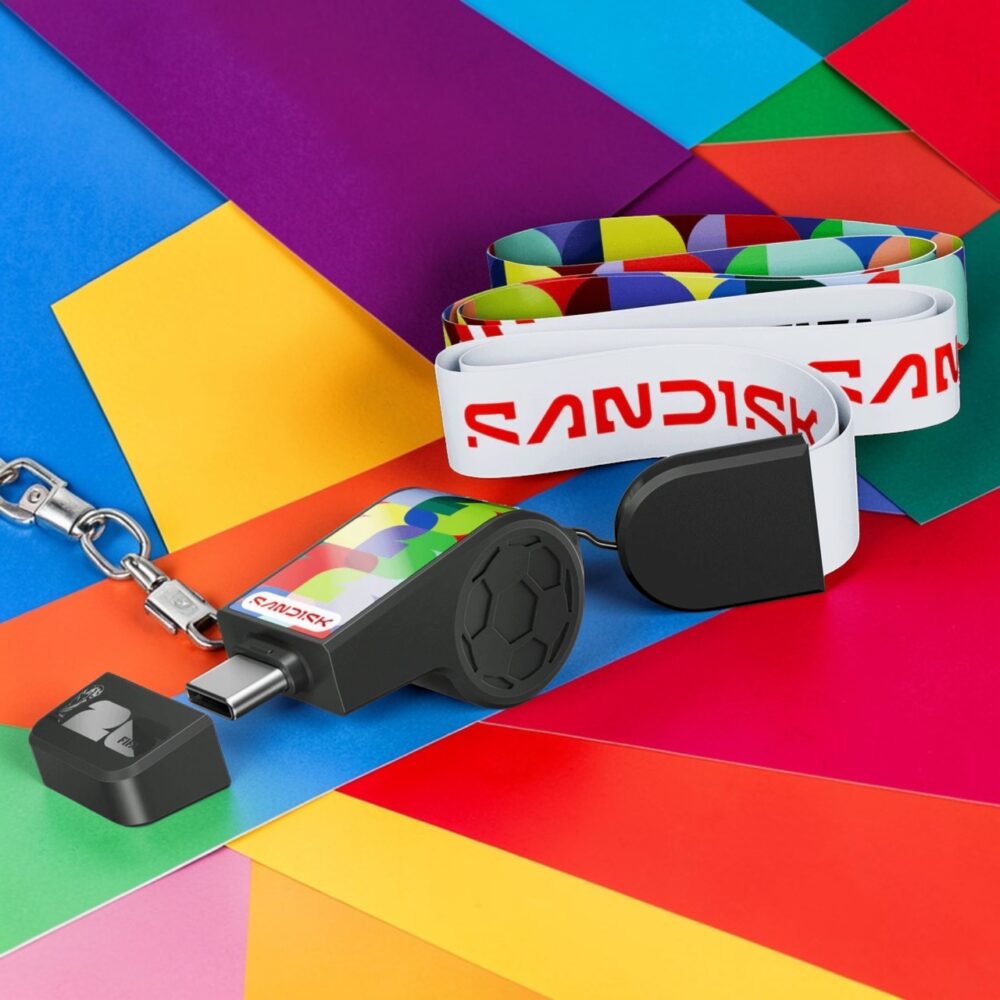The USB-C flash drive feels like it should be a gimmick. It’s shaped like a whistle, comes with a lanyard, and leans heavily into the World Cup theme. But once you start using it, it becomes surprisingly practical. With up to 300MB/s read speeds, it’s fast enough to move large files quickly, and that USB-C connector makes it incredibly versatile.