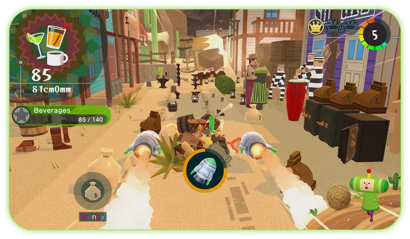 See, Katamari’s always been about scale—about that intoxicating leap from picking up paperclips to snatching entire skyscrapers. But Once Upon a Katamari doesn’t just go bigger; it goes smarter. The time-travel conceit gives every level a distinct flavor, turning what could’ve been another colorful clean-up job into a parade of cultural remixing. One moment you’re rolling a snowball in the Ice Age, scooping up mammoths while dodging volcanoes; the next, you’re stealing gold bars from a saloon shootout as tumbleweeds bounce off your growing mass. It’s like someone mashed up Bill & Ted’s Excellent Adventure with the world’s most satisfying physics toy.