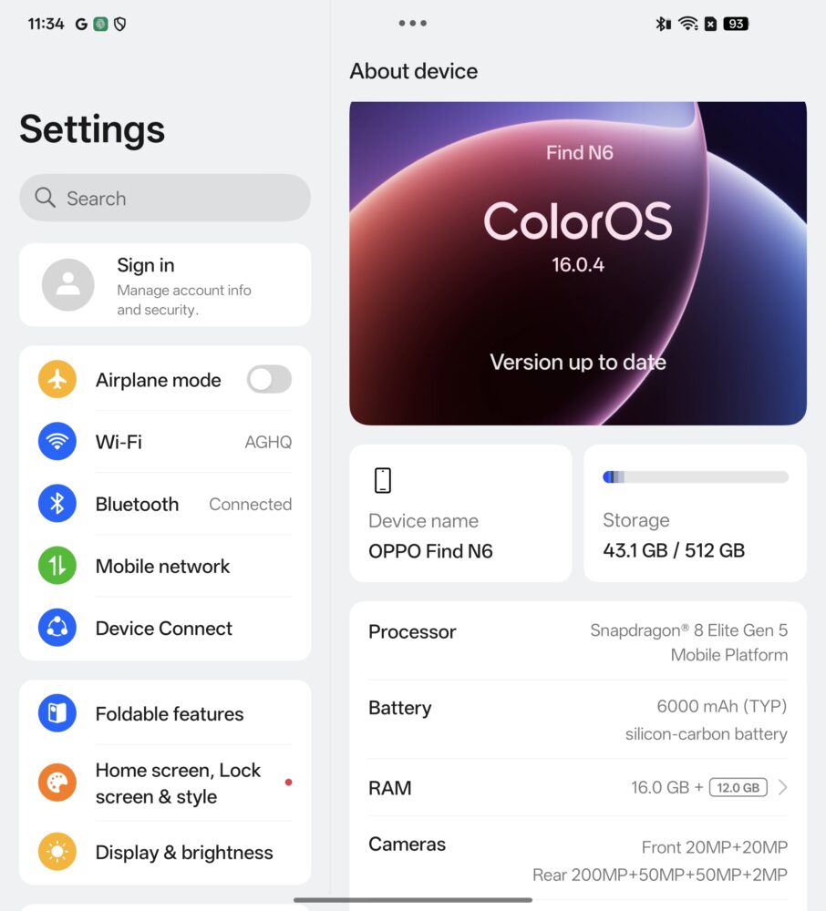 The Find N6 packs a massive 6000mAh silicon-carbon battery. That capacity rivals or exceeds many traditional flagship smartphones.