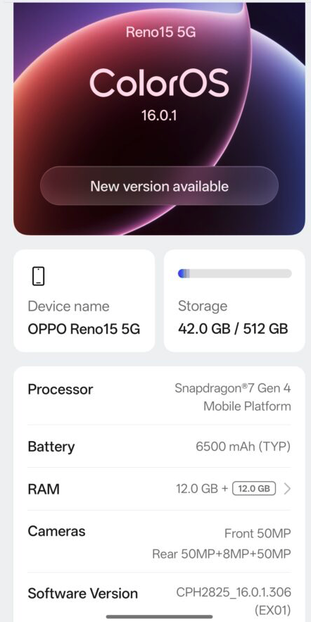 Powering the Reno15 5G is Qualcomm’s Snapdragon 7 Gen 4 mobile platform, paired with either 8GB or 12GB of LPDDR5X RAM and fast UFS 3.1 storage in 256GB or 512GB configurations.