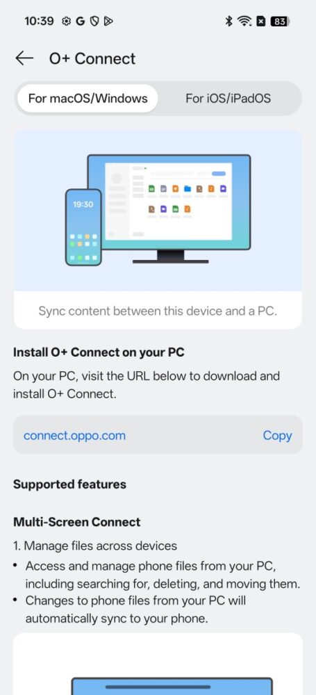 On macOS, O+Connect enables Multi-Screen Connect, letting you view and interact with your phone directly from your Mac. Files move wirelessly between devices, notifications stay in sync, and basic phone interactions happen without reaching for the handset. It’s smooth, stable, and feels more like an extension of your desktop than a clunky mirror.
