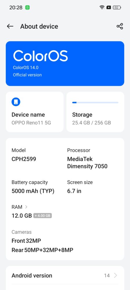 On the front the Reno11 has a 32MP selfie camera OmniVision OV32C f/2.4 aperture lens with 22mm focal length for your selfies and more.