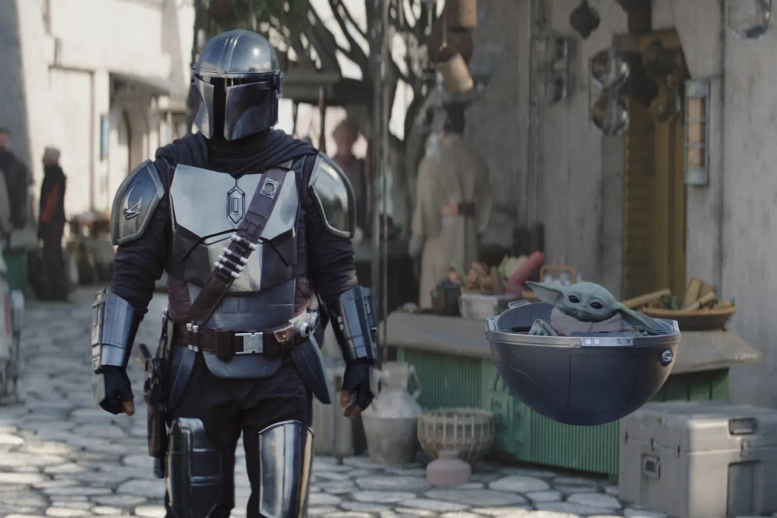 At this point, Din Djarin is pure professional. No face. No attachments. No time for your nonsense. He’s a walking Clint Eastwood silhouette with a jetpack and a code. And then the episode ends with him staring down at a hovering pram containing a 50-year-old toddler who looks like Yoda’s funko-pop-ified cousin.