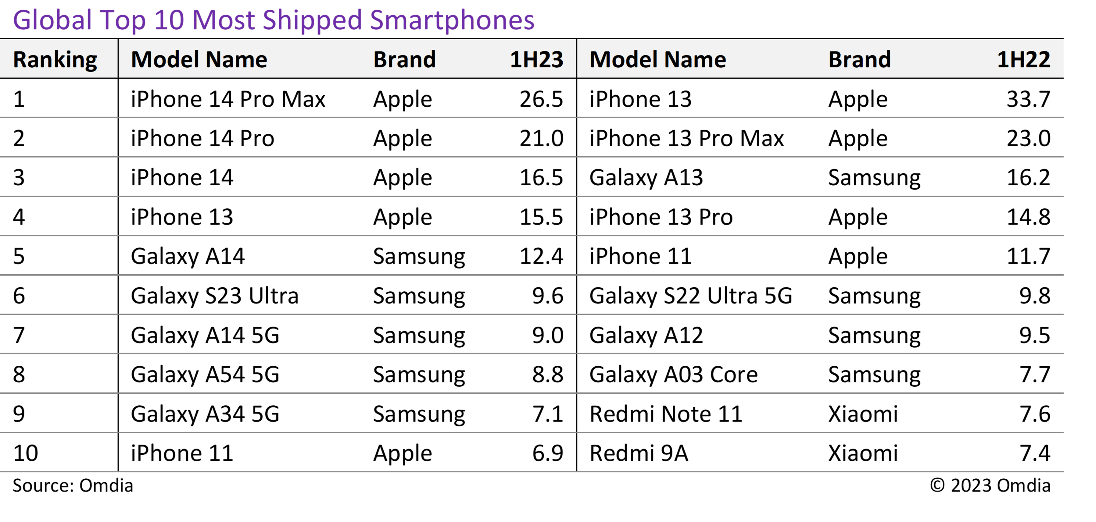 Comparing the top 10 models for the same period last year, shipments of the top-ranked model decreased by 7.2 million units for this year’s iPhone 14 Pro Max. The iPhone 13 was last year’s top selling model with a total of 33.7 million units shipped. However, when comparing the same lineup, the iPhone 13 Pro Max, which took second place last year, shipped 23 million units whereas its successor, the 14 Pro Max, shipped 3.5 million units more this year and rose in rankings by one notch. Shipments of the 14 Pro increased by 6.2 million units compared to its predecessor, the 13 Pro, and saw its ranking rise by two notches. However, comparing the standard 13 and 14 models, shipments of the 14 this year decreased by 17.2 million units compared to the 13.