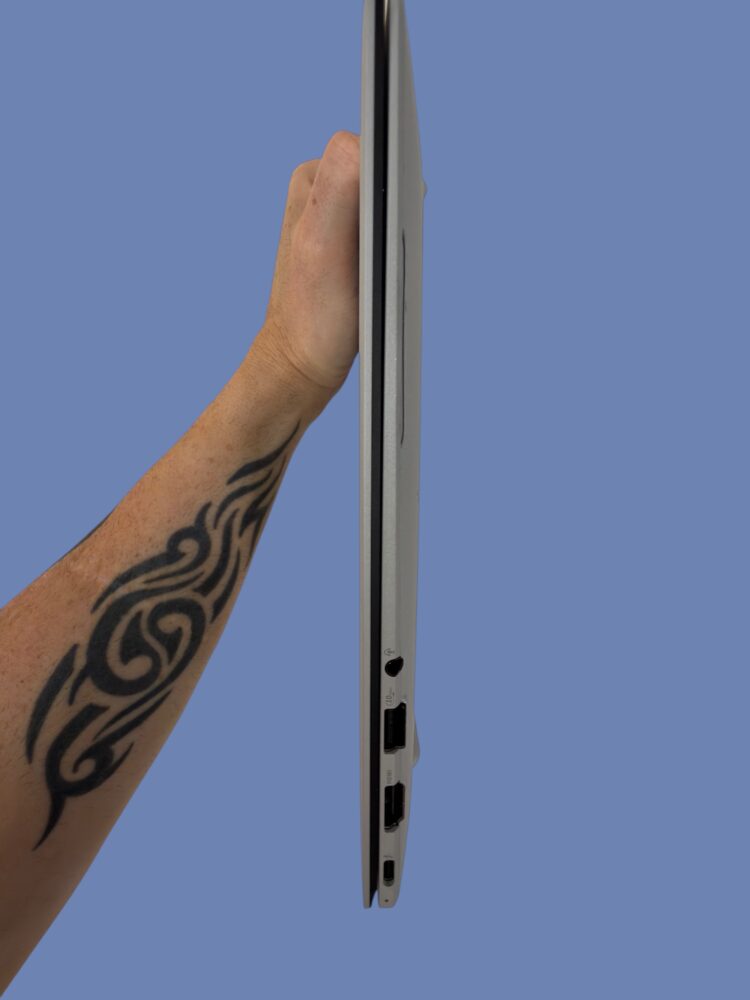 The thickness of the device measures just under eleven millimeters, which places it firmly in ultrabook territory. What’s particularly impressive is that the laptop does not feel fragile despite those dimensions. When you twist the base slightly or open the lid with one hand, the structure remains rigid and well controlled.