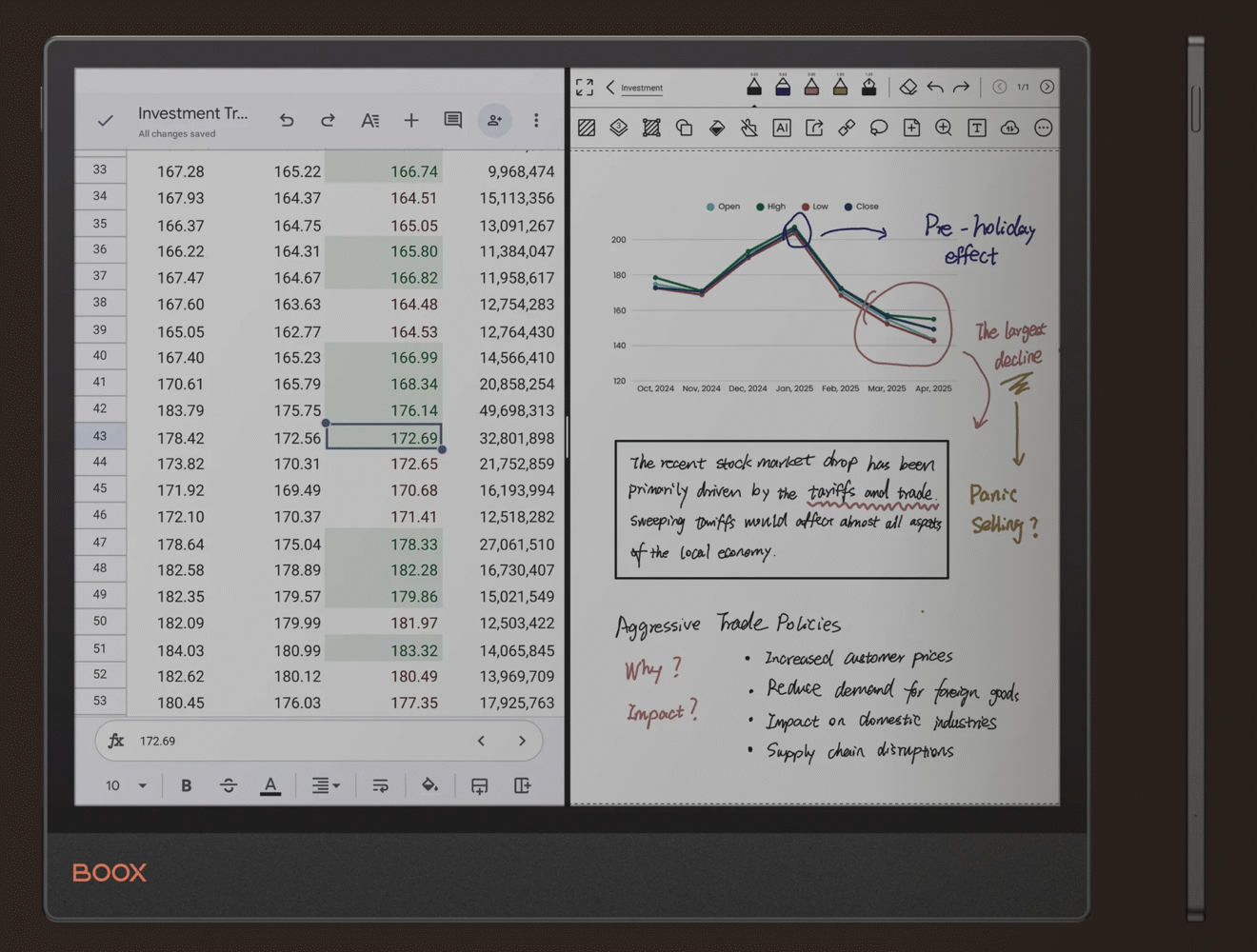 While the display is central to the Tab X C’s appeal, its functionality goes beyond reading. With an octa-core processor, 6GB of RAM, and BOOX’s proprietary BSR tech for enhanced refresh rates, the tablet supports multitasking features such as split-screen views for comparing documents, analyzing charts, or combining note-taking with reading. The device’s deep space gray finish and ultra-slim chassis offer a design that fits into professional contexts without compromising on performance.