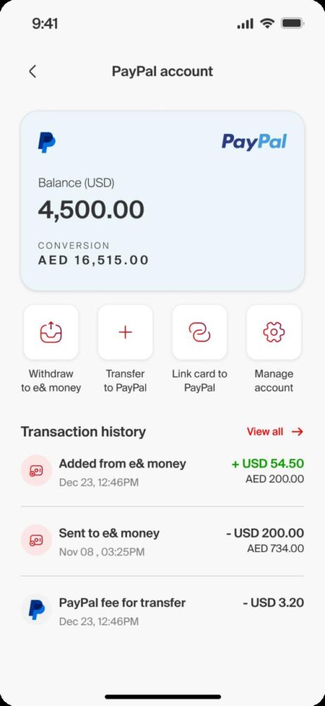 Once the service launches, users will be able to link their PayPal accounts with the e& money app, allowing them to move funds instantly from PayPal to their e& money wallets. The integration will convert U.S. dollar balances to UAE dirhams (AED) at a fixed exchange rate, with transparent, upfront fees and no hidden charges.