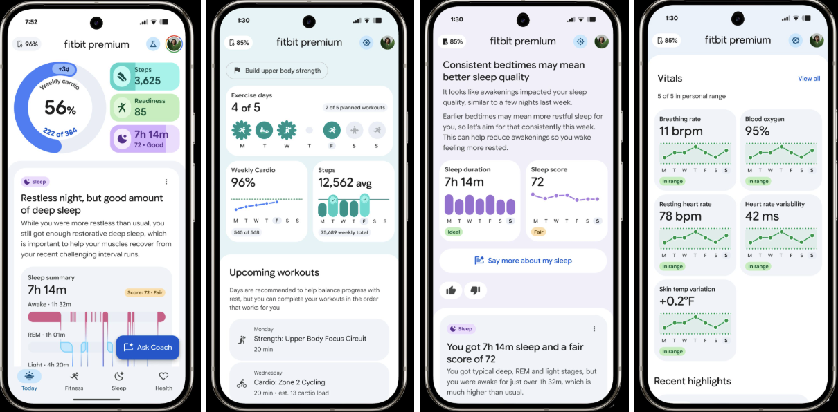 Available to Fitbit Premium subscribers at $9.99 per month, the AI coach is designed to act less like a static tracker and more like a digital wellness companion. Users can ask questions about their data—such as why their sleep score dropped or how to balance workout intensity—and receive context-aware responses that combine their personal metrics with general health insights. The redesigned app organizes everything into four main tabs: Today, Fitness, Sleep, and Health, each structured around more interactive and long-term insights.