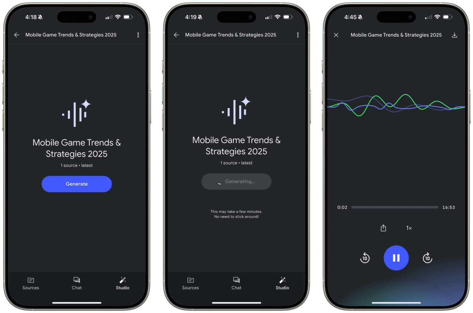 Where the mobile version stands out is in its focus on audio. From the Chats tab, users can generate audio summaries and podcast-style deep dives that draw directly from their uploaded content. These audio files can be saved locally, which makes them especially useful for offline listening during commutes, study sessions, or while multitasking. Playback controls include speed adjustment, skip controls, sharing options, and standard play/pause functions.