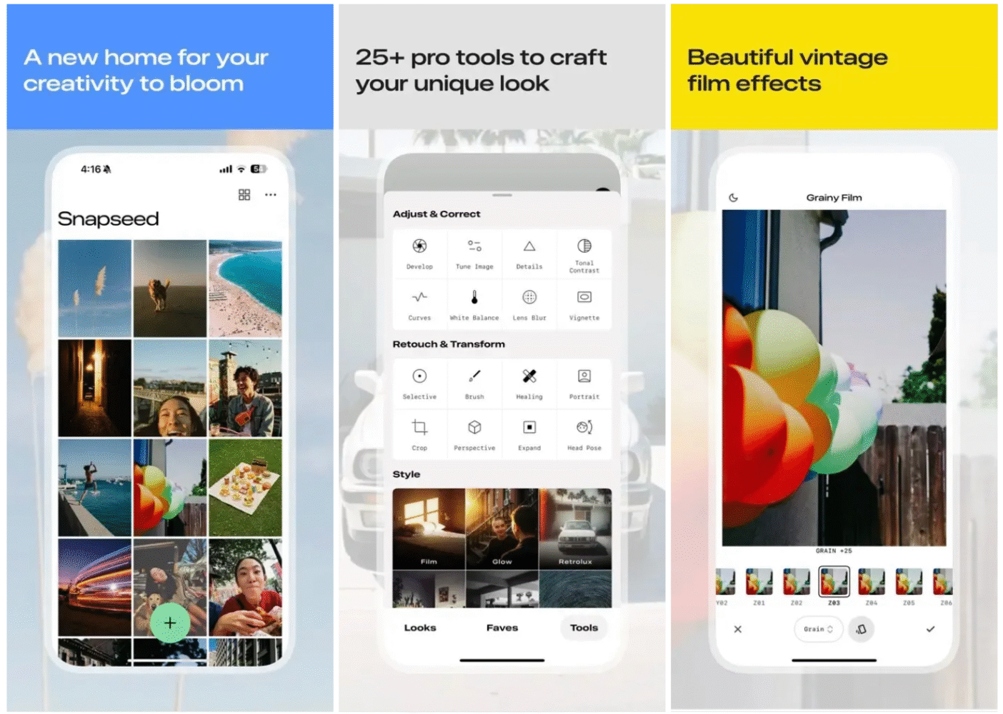 Snapseed’s toolset remains expansive, with categories spanning correction, transformation, stylization, and creative enhancements. Users can access familiar tools like Curves, Healing, Lens Blur, and Portrait, alongside creative effects like Retrolux, Noir, and Double Exposure. The update also introduces a new “Film” style filter under the Style tab.