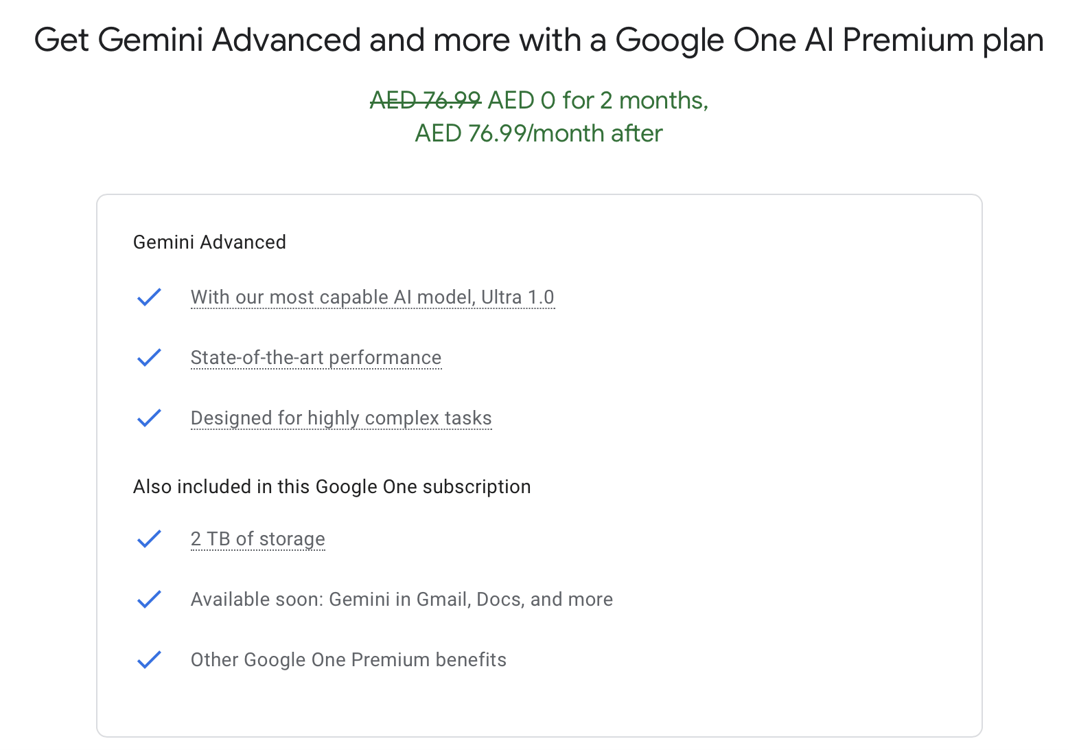 While the free trial lets you explore, “Advanced” access comes with a premium price tag. Compared to the regular 2TB Google One plan, it’s 50% more expensive. In the UAE, the price is set AED 76.99/month.