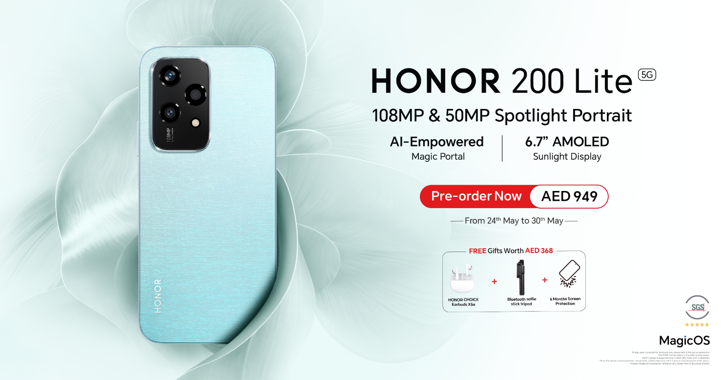The HONOR 200 Lite offers 256GB of storage and includes HONOR RAM Turbo (8GB+8GB) technology for improved performance. Pre-orders can be placed through the HONOR Online Store, Amazon, and Noon, with free gifts worth AED 368 included for early buyers.