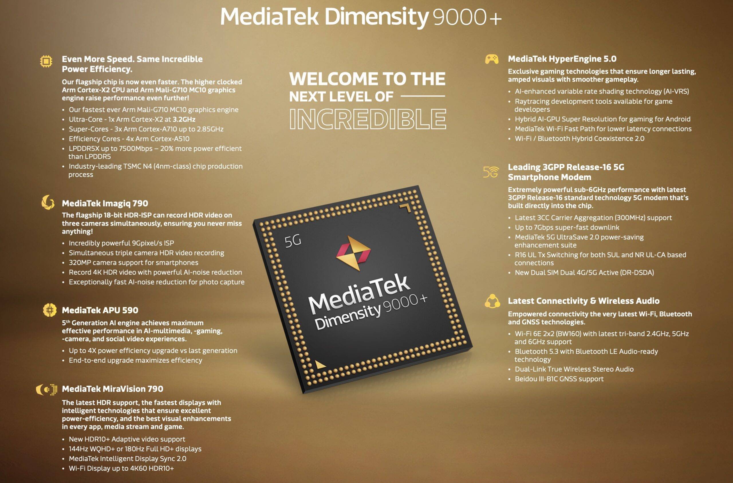 MediaTek announced the Dimensity 9000+, an enhancement to the company’s top-of-the-line 5G smartphone chipset. This new high-end offering delivers a boost in performance over the Dimensity 9000 to make the next generation of flagship smartphones even more powerful and efficient.