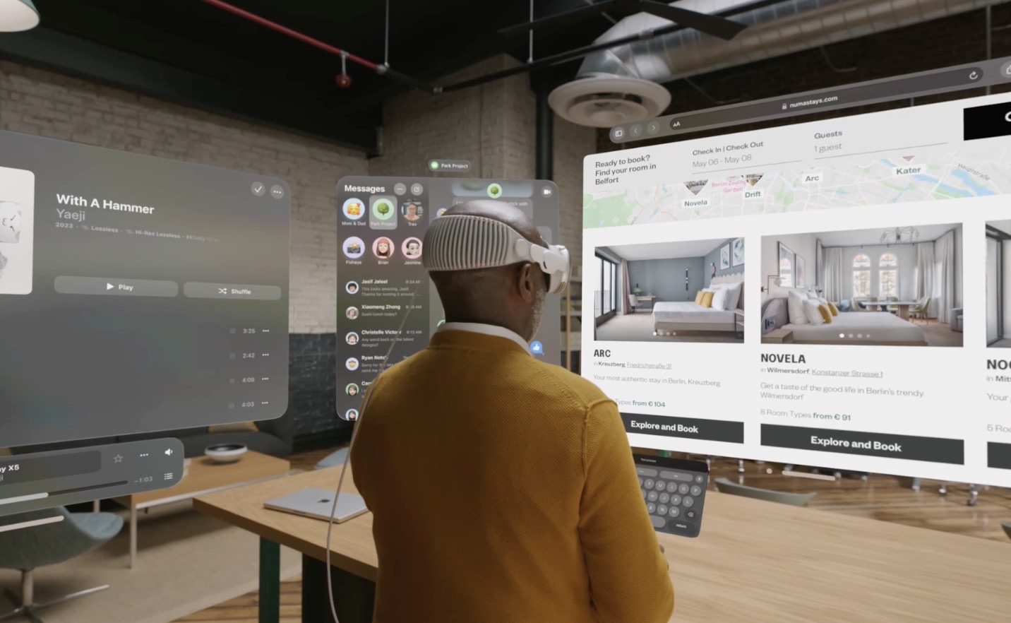 An infinite canvas for apps at work and at home: visionOS features a three-dimensional interface that frees apps from the boundaries of a display so they can appear side by side at any scale. Apple Vision Pro enables users to be even more productive, with infinite screen real estate, access to their favorite apps, and all-new ways to multitask. And with support for Magic Keyboard and Magic Trackpad, users can set up the perfect workspace or bring the powerful capabilities of their Mac into Vision Pro wirelessly, creating an enormous, private, and portable 4K display with incredibly crisp text.