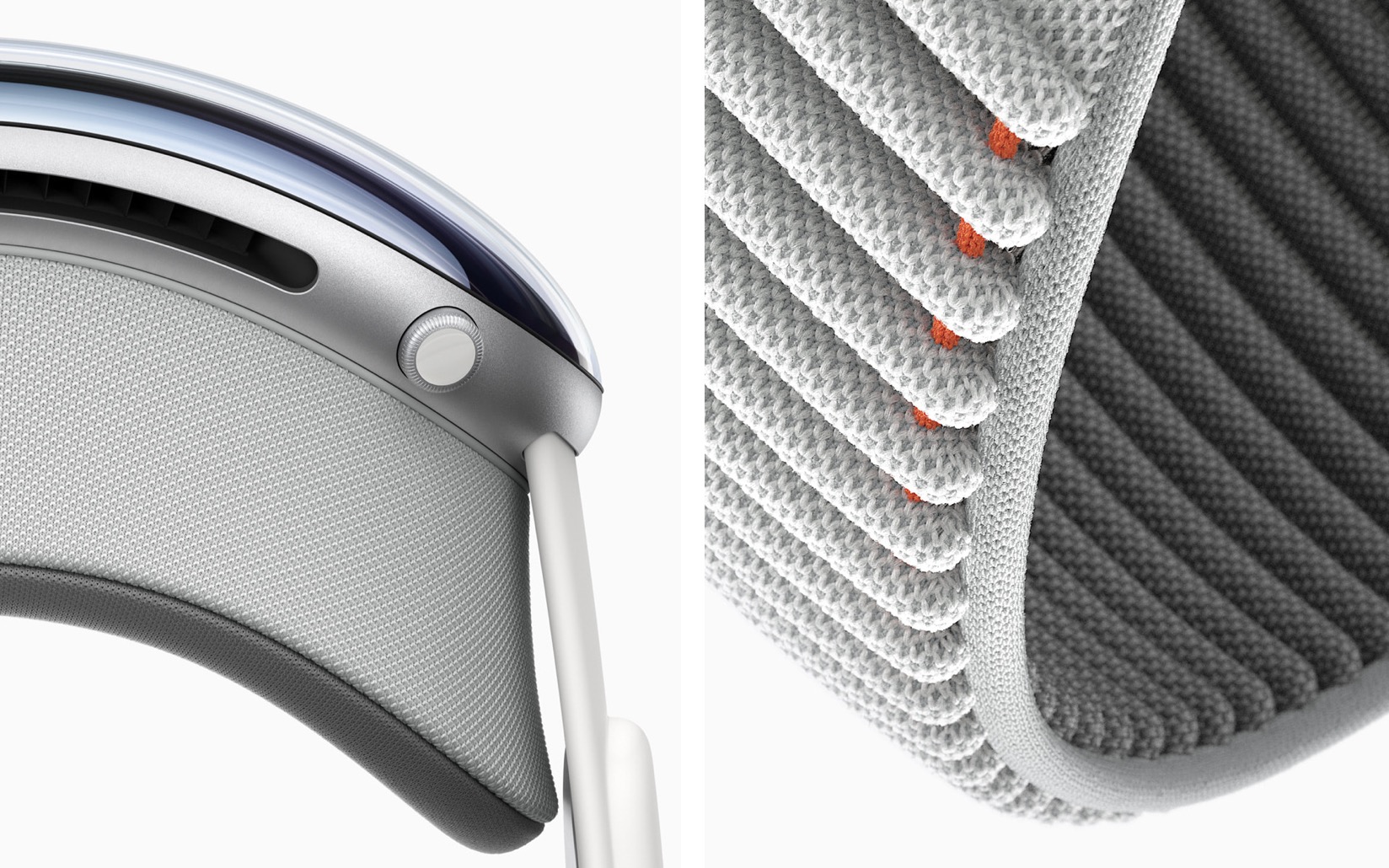 Apple Vision Pro has an astonishing amount of technology in a compact design. A singular piece of three-dimensionally formed and laminated glass is polished to create an optical surface that acts as a lens for the wide array of cameras and sensors needed to blend the physical world with digital content. The glass flows into the custom aluminum alloy frame that gently curves around the user’s face, while the modular system allows for a tailored fit to accommodate a wide range of people. The Light Seal is made of a soft textile, and comes in a range of shapes and sizes, flexing to conform to a user’s face for a precise fit. Flexible straps ensure audio remains close to the user’s ears, while a Head Band — available in multiple sizes — is three-dimensionally knitted as a single piece to provide cushioning, breathability, and stretch. The band is secured with a simple mechanism, making it easy to change to another size or style of band.