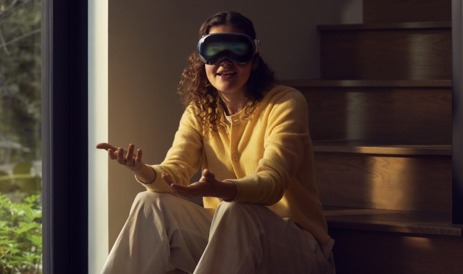 Apple Vision Pro also features EyeSight, an extraordinary innovation that helps users stay connected with those around them. When a person approaches someone wearing Vision Pro, the device feels transparent — letting the user see them while also displaying the user’s eyes. When a user is immersed in an environment or using an app, EyeSight gives visual cues to others about what the user is focused on.