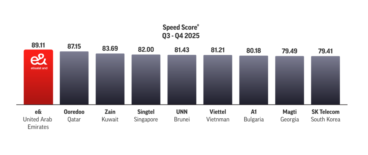In addition to the overall mobile network recognition, e& UAE was also awarded the title of World’s Fastest 5G Network for Q3–Q4 2025. This marks the fourth consecutive time the operator has received this 5G-specific award. During the same testing period, the company achieved a 5G Speed Score™ of 83.68, with reported average download speeds of 993.96 Mbps and upload speeds of 58.21 Mbps. As 5G deployment continues to mature across global markets, sub-1 Gbps average download speeds at scale remain relatively uncommon, placing the UAE operator among the higher-performing networks measured in this cycle.