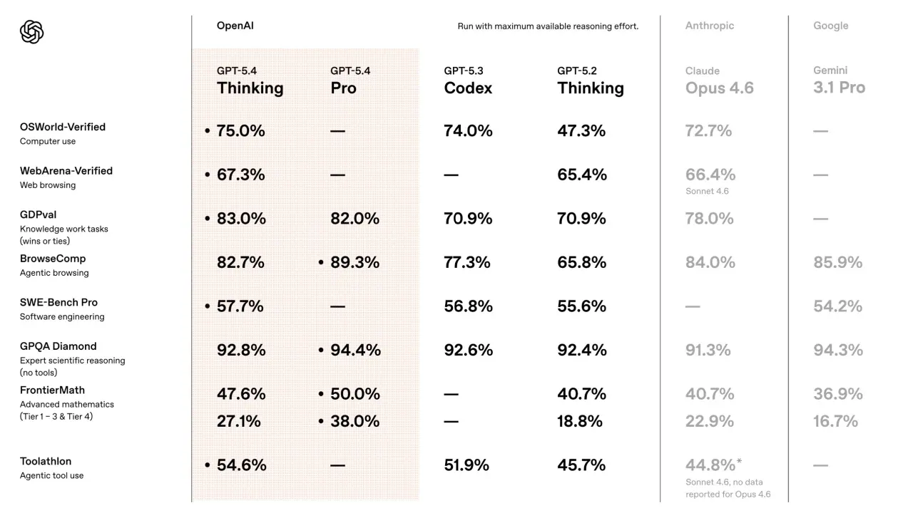 Benchmark results shared by OpenAI show GPT-5.4 reaching an 83 percent score on the GDPval evaluation and 81.2 percent on the MMMU-Pro benchmark without external tools. According to the company’s comparison data, those figures place the model slightly ahead of competing systems such as Gemini 3.1 Pro, which achieved an 80.5 percent score in the same test.