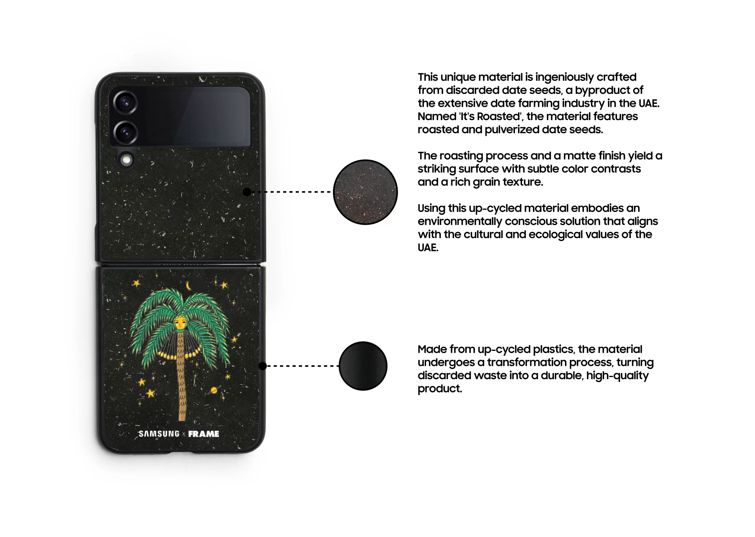 DateForm is a UAE-based material innovation startup producing solid surface materials from date seeds, a by-product of the sizable date farming industry. Its designers created a Galaxy Z Flip4 phone case from seeds discarded from making jujube desserts at a date factory.