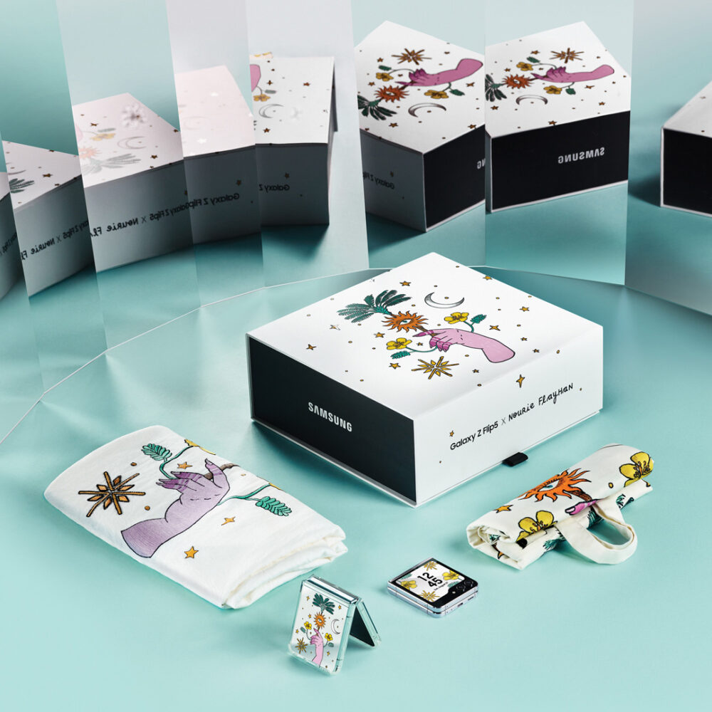 The ‘Whimsical Midsummer Collection’ Galaxy Z Flip5 bundle includes a customized Flip5 cover, Abaya and a tote bag. Users can also download an animated wallpaper that compliments the cover design. Included in the box is a poem and a QR Code to download animated wallpaper that compliments the cover design.