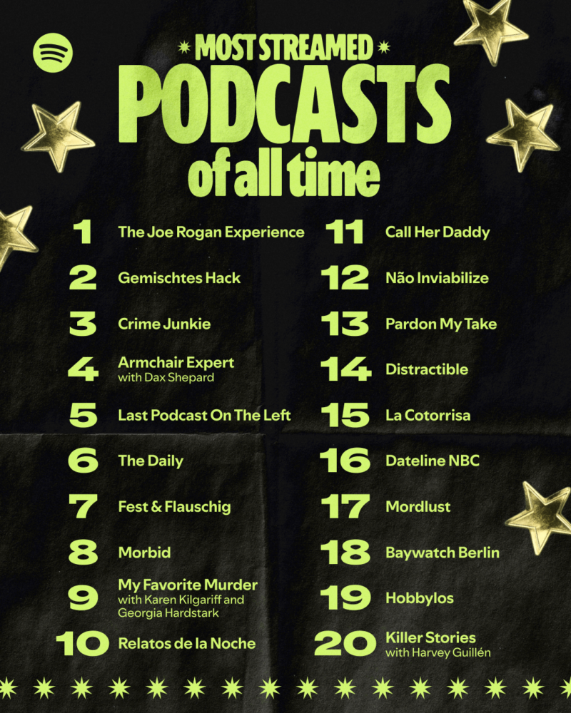 Podcasts and audiobooks add another dimension. The Joe Rogan Experience tops the podcast list by a wide margin, underscoring the pull of long-form conversation in a short-attention culture. True-crime favorites like Crime Junkie and My Favorite Murder sit alongside regional hits from Germany, Mexico, and Brazil, illustrating Spotify’s international expansion. In audiobooks, Sarah J. Maas’s A Court of Thorns and Roses series dominates, joined by fantasy staples like The Fellowship of the Ring and contemporary hits including Fourth Wing and It Ends with Us. Non-fiction such as The 48 Laws of Power and Sapiens also rank high, pointing to self-improvement and big-idea listening as steady categories.
