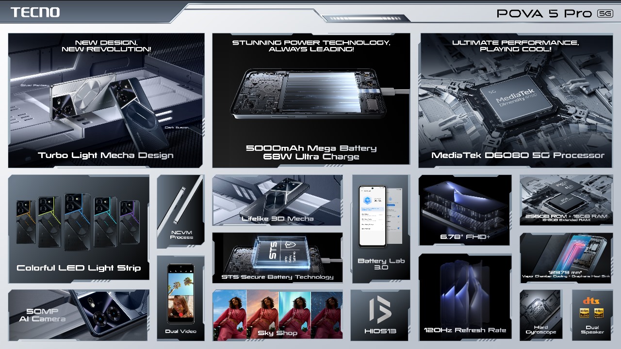 4. The POVA 5 Series introduces the Turbo-Charged Mecha Design, blending technology and energy into the device’s aesthetic. Additionally, the POVA 5 Pro 5G features the industry’s first Turbo Light Mecha Design, incorporating an LED light strip that enhances the overall look and offers interactive features for users.