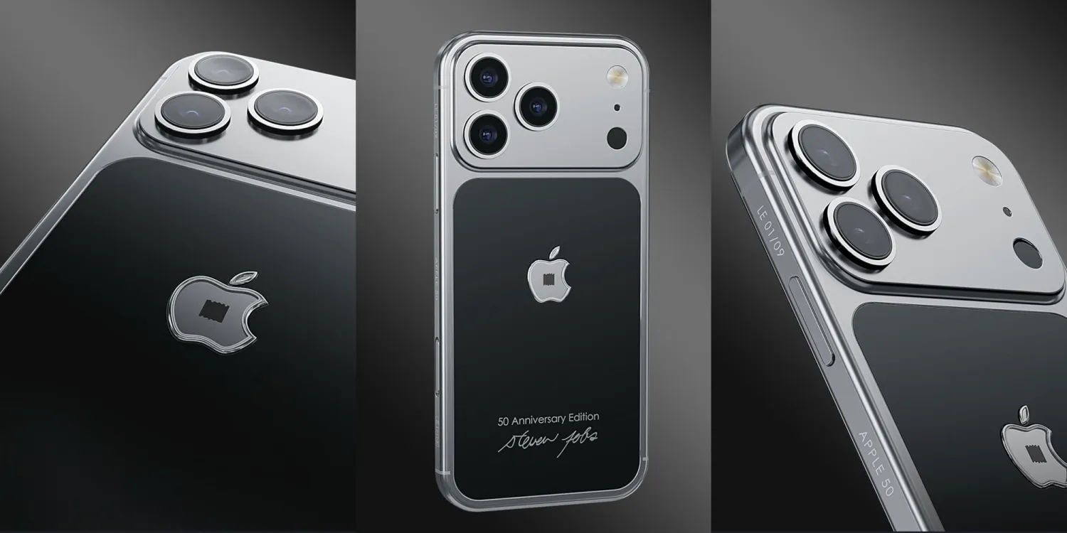 The concept centers on embedding a tiny piece of fabric, described as originating from one of Jobs’ well-known turtlenecks, into the back of the device. This material is placed within the Apple logo area and accompanied by a reproduction of Jobs’ signature. The rest of the design draws loosely from the original iPhone’s aesthetic, combining a black panel with a silver-toned titanium body treated with a PVD coating.