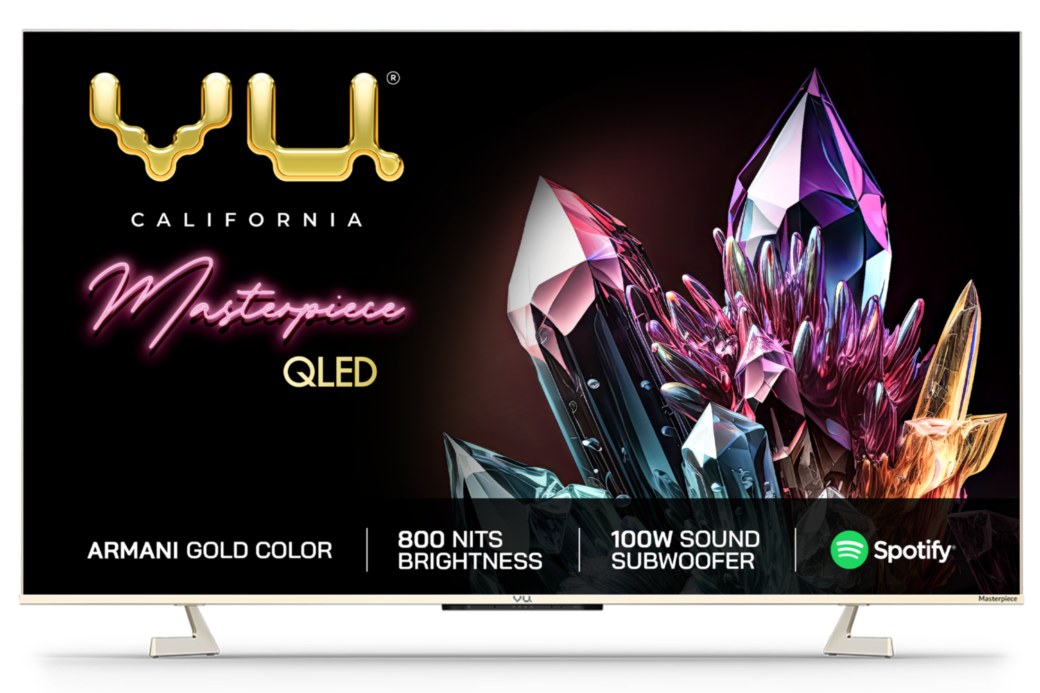 Vu Masterpiece Glo Series comes in 75, 65 and 55 inches with Armani Gold aesthetics and a sleek design. The Real 4K Quantum Dot Technology, coupled with a 120Hz refresh rate and Dolby Vision IQ, delivers a breathtakingly lifelike viewing experience. With 800nits peaking brightness and a Full Array of Local Dimming, every frame is a symphony of clarity and contrast. The audio experience is equally impressive, featuring a 100W DJ Sound system with a built-in subwoofer and Dolby Atmos Surround Sound. Gaming reaches new heights with 4K capabilities at 120Hz, driven by a powerful CPU and GPU. The Vu Masterpiece Series redefines home entertainment, combining elegance, technology, and performance in perfect harmony.