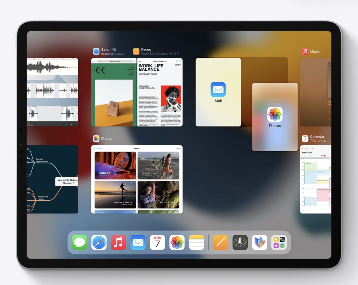 iPadOS 15 makes working with multiple apps easier than ever. A new multitasking menu appears at the top of apps, letting users go into Split View or Slide Over with just a tap. Users now have quick access to the Home Screen when using Split View, making it easier to get to the right app. Using the new shelf, they can also multitask with apps that have multiple windows like Safari® and Pages®, as well as quickly preview emails.