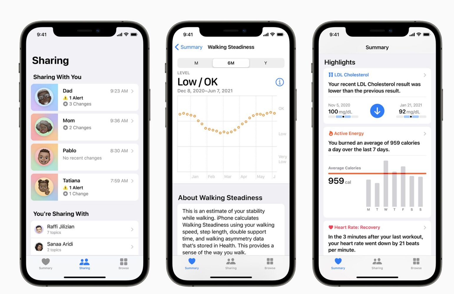 - The Health app gets a new sharing tab that lets users share their health data with family, caregivers, or a care team, Trends gives users a way to focus attention on meaningful changes in personal health metrics, and Walking Steadiness is a new metric that empowers people to proactively manage their fall risk.
